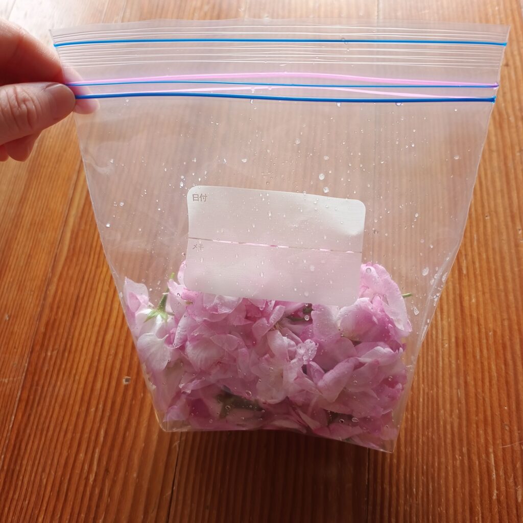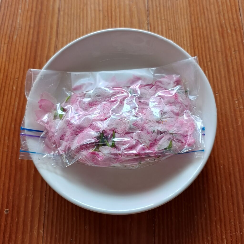塩もみした桜と残りの塩、酢(30ml)をジップロックに入れます。