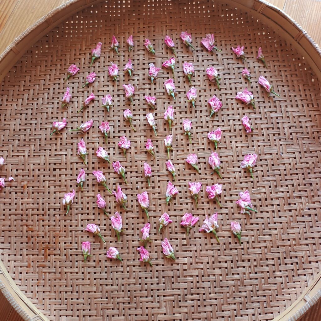 ⑤漬かったら、桜を取り出し、軽く水気をふき取り、花びらの形を整えて竹ざるに並べます。